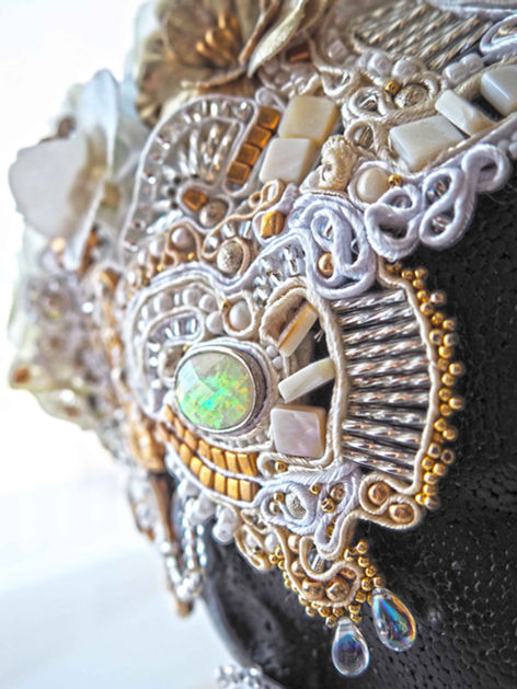 The color scheme is based on the shades of the white and the gold. The beads have pearls and gold color. Some of them have glass reflection. The parts of the headpiece are flowers and silk fabric. The patterns are abstract and mostly in organic shape.